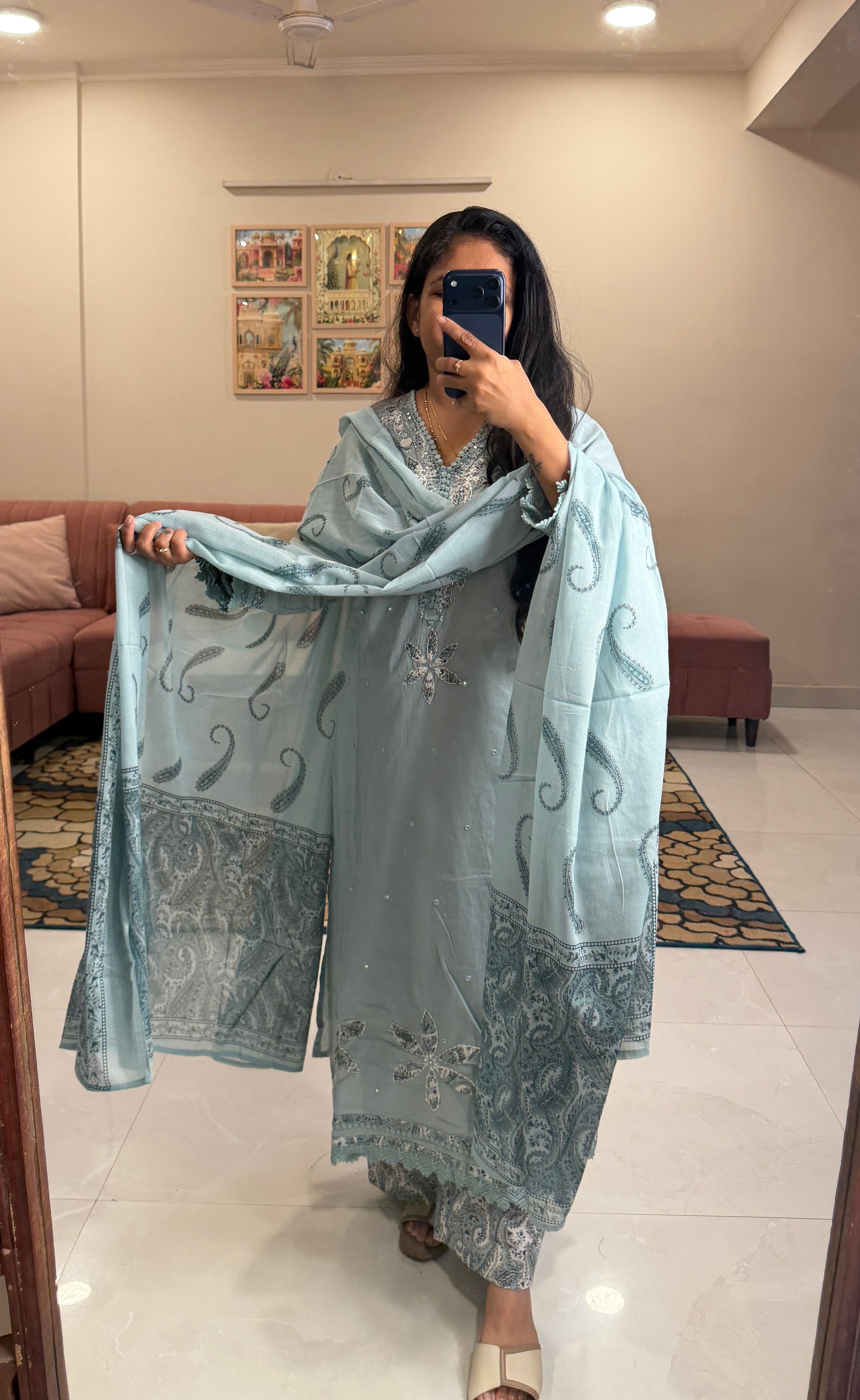 Elegant cotton Kurta Pant & Dupatta set featuring a pastel sage Aqua kurta with intricate mirror and embroidery work on the yoke, decorated with printed patchwork and embellished with delicate silver sequins with textured lace detailing.