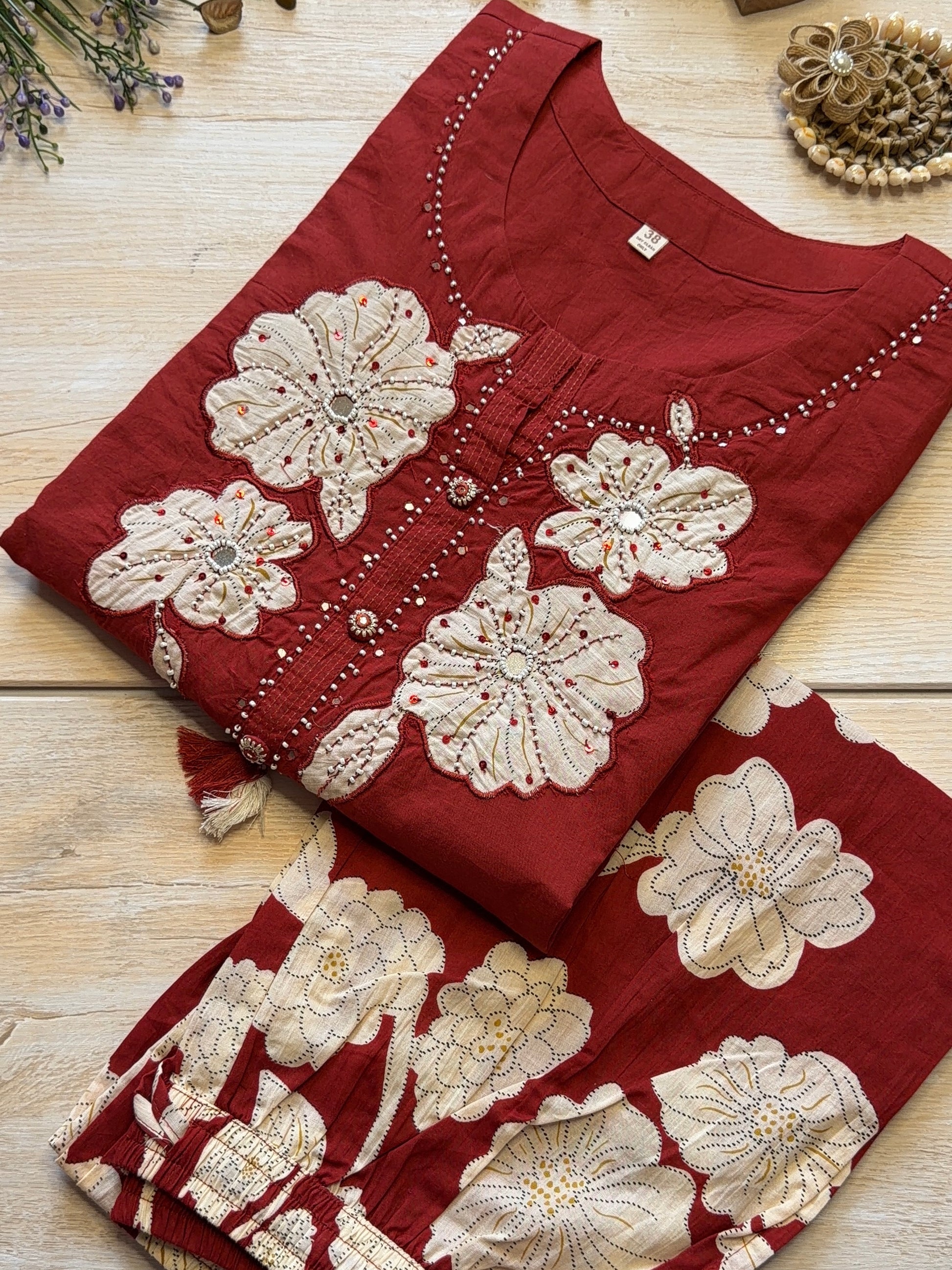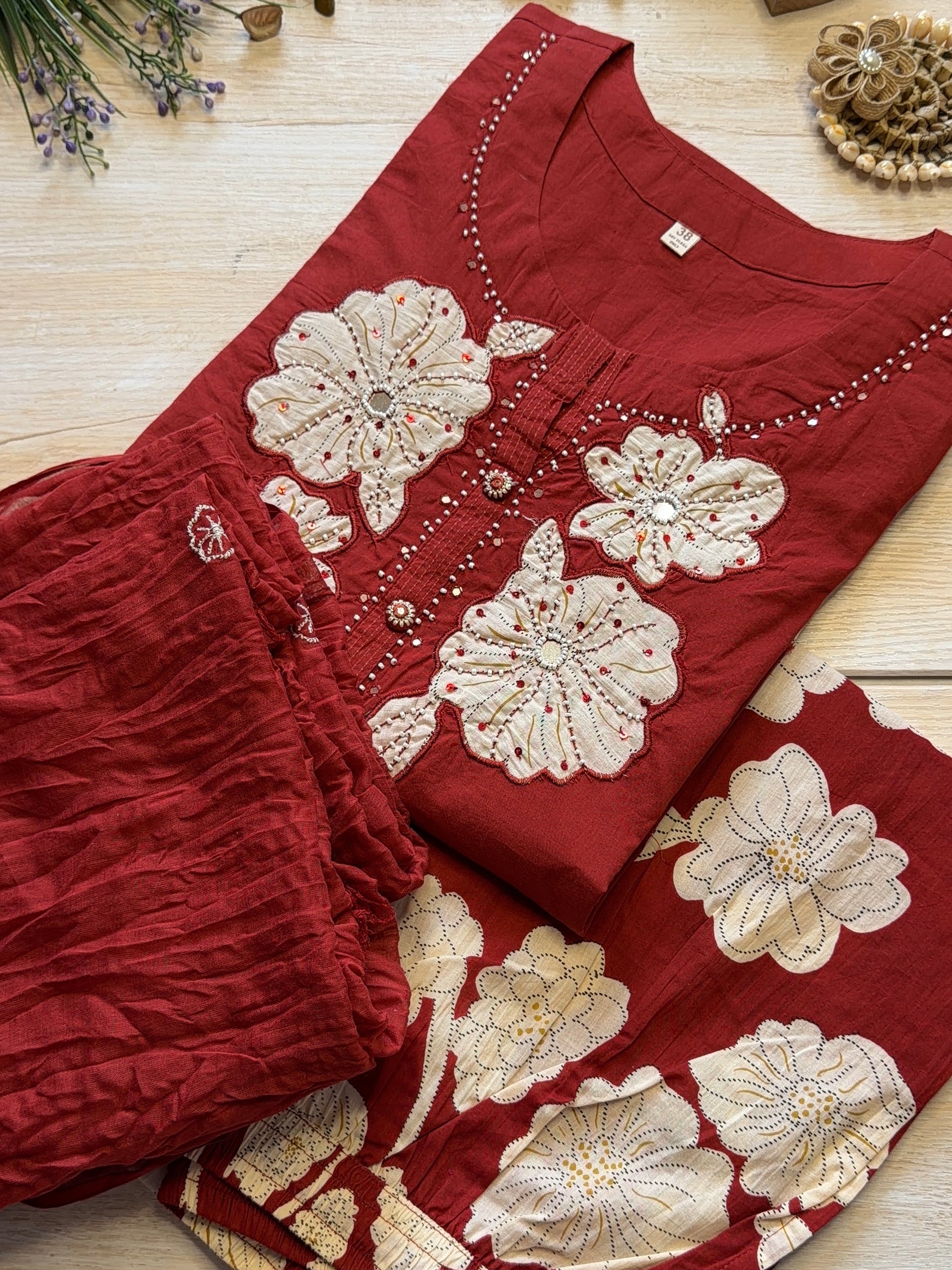 Experience the timeless elegance of our Brick Floral Kurta Pant Dupatta Set, a premium three‑piece ensemble crafted from soft cotton.