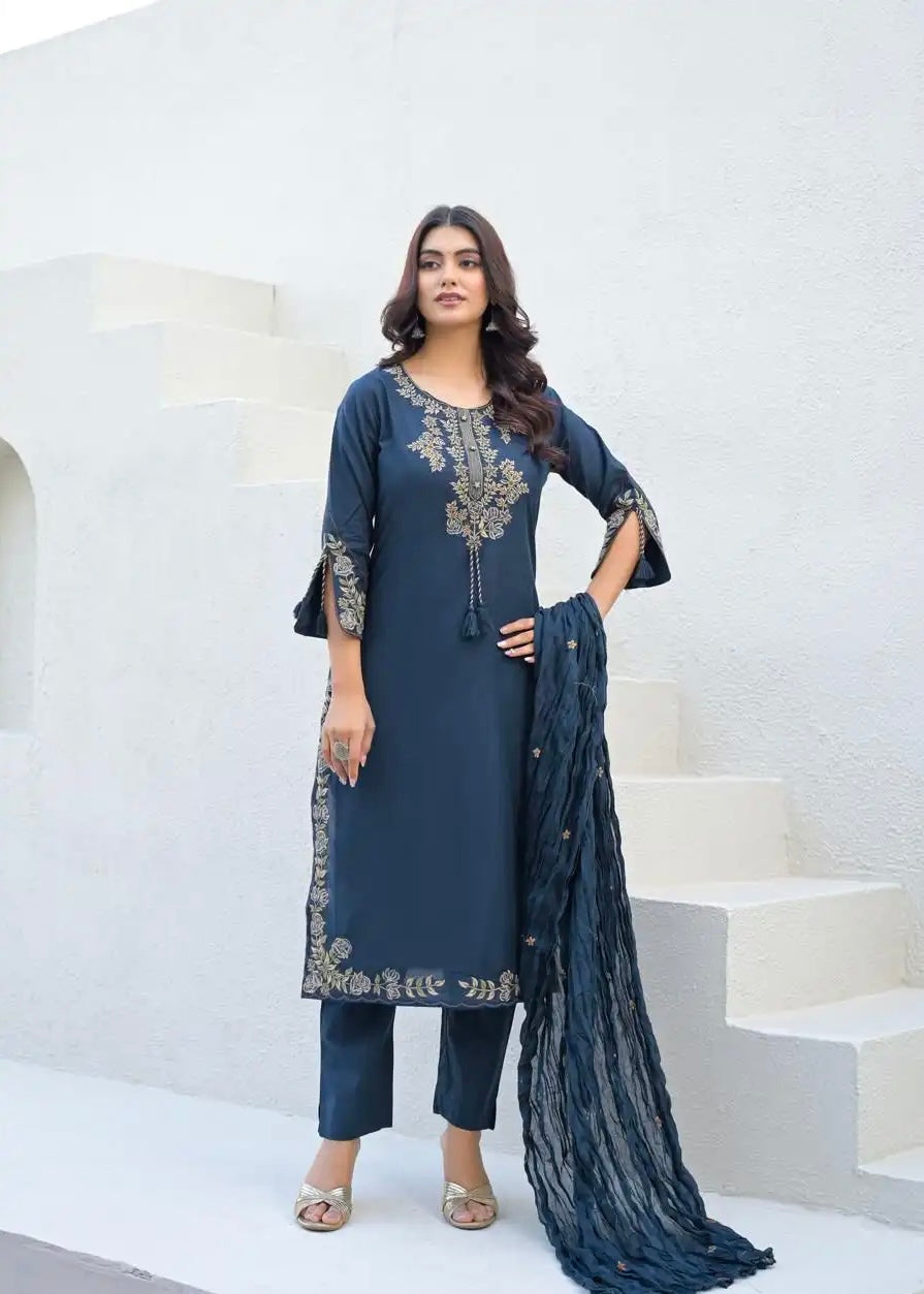 Get your hands on our most decent embroidered kurta made in beautiful colour combination and embroidery all over paired with embroidery motifs dupatta,and embroidered hem pants.