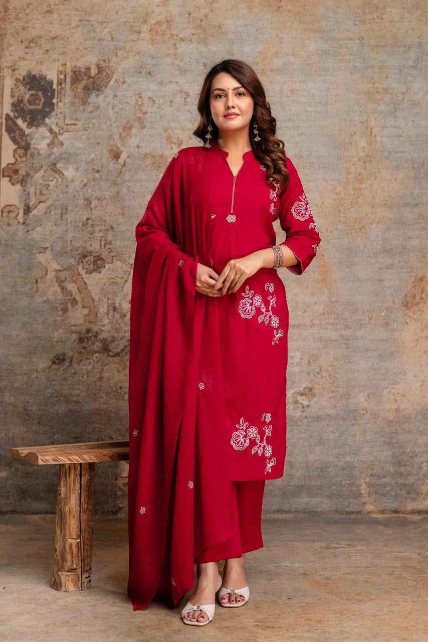 Get your hands on our most decent embroidered kurta made in beautiful colour combination and embroidery all over paired with embroidery motifs dupatta,and pants.